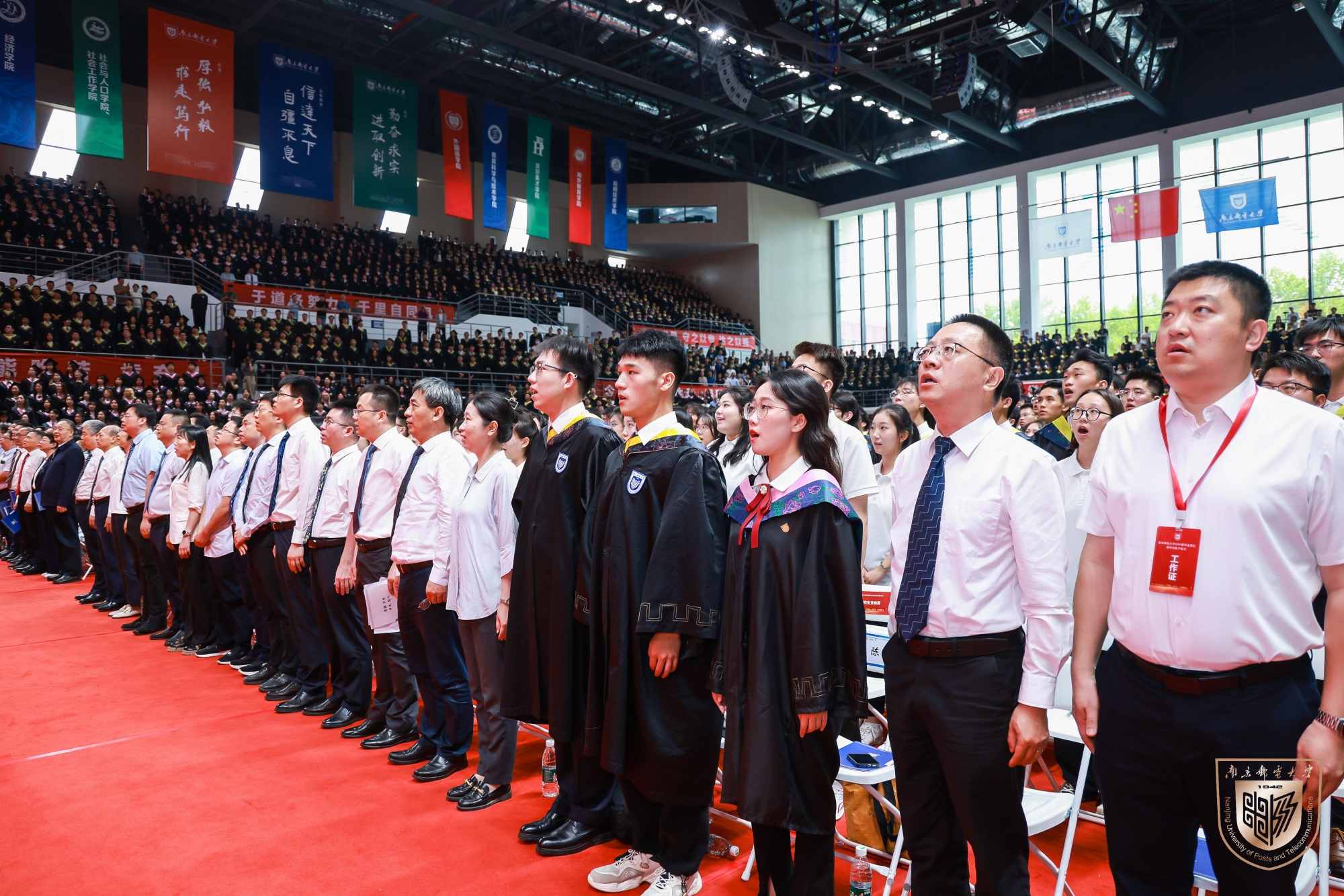 “我光荣地毕业于南京邮电大学,我将牢记我校校训,传承南邮精神,恪守恩师教诲。不负韶华,不忘初心……”全体毕业生起立宣誓,齐唱《毕业歌》和校歌《信达天下》。