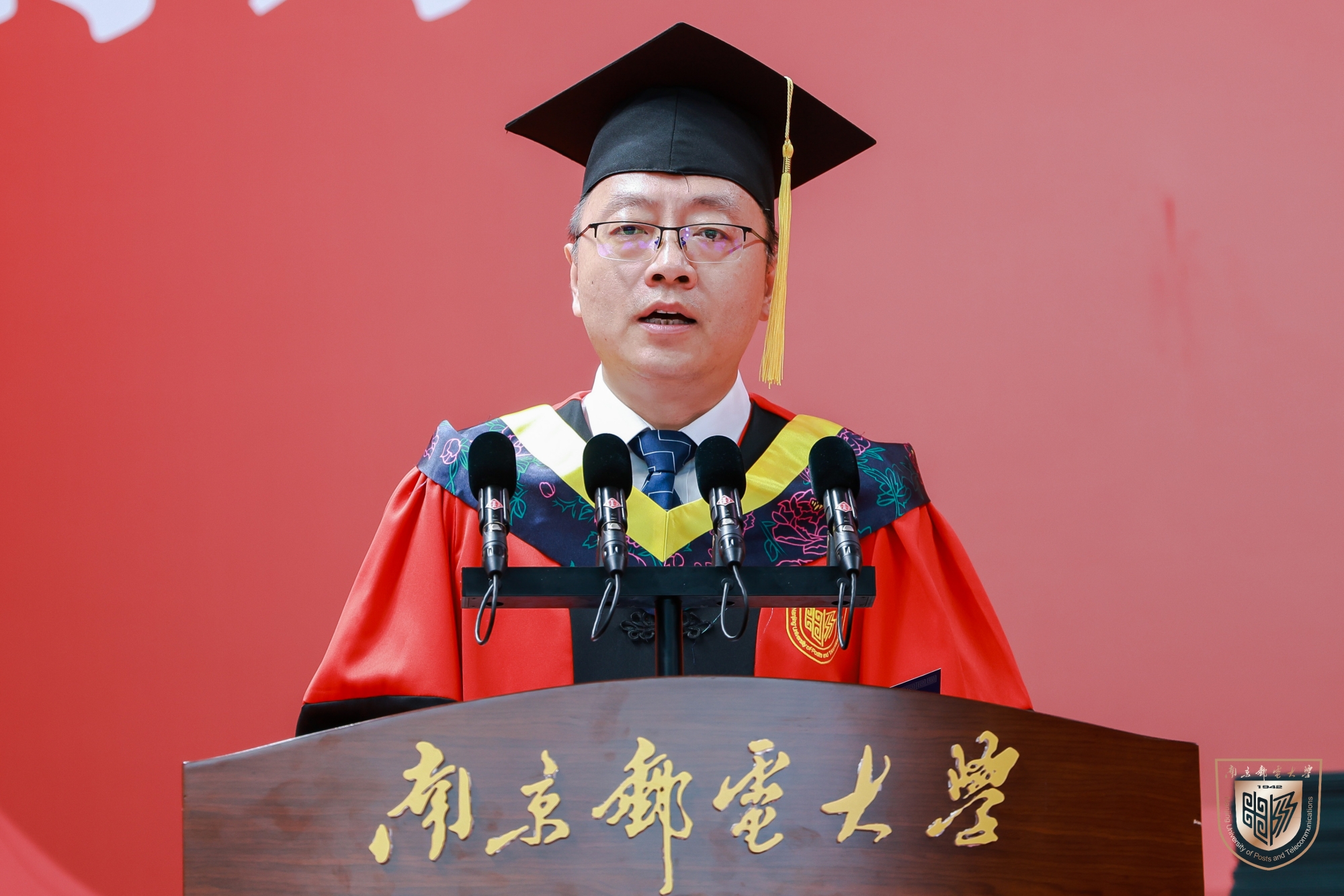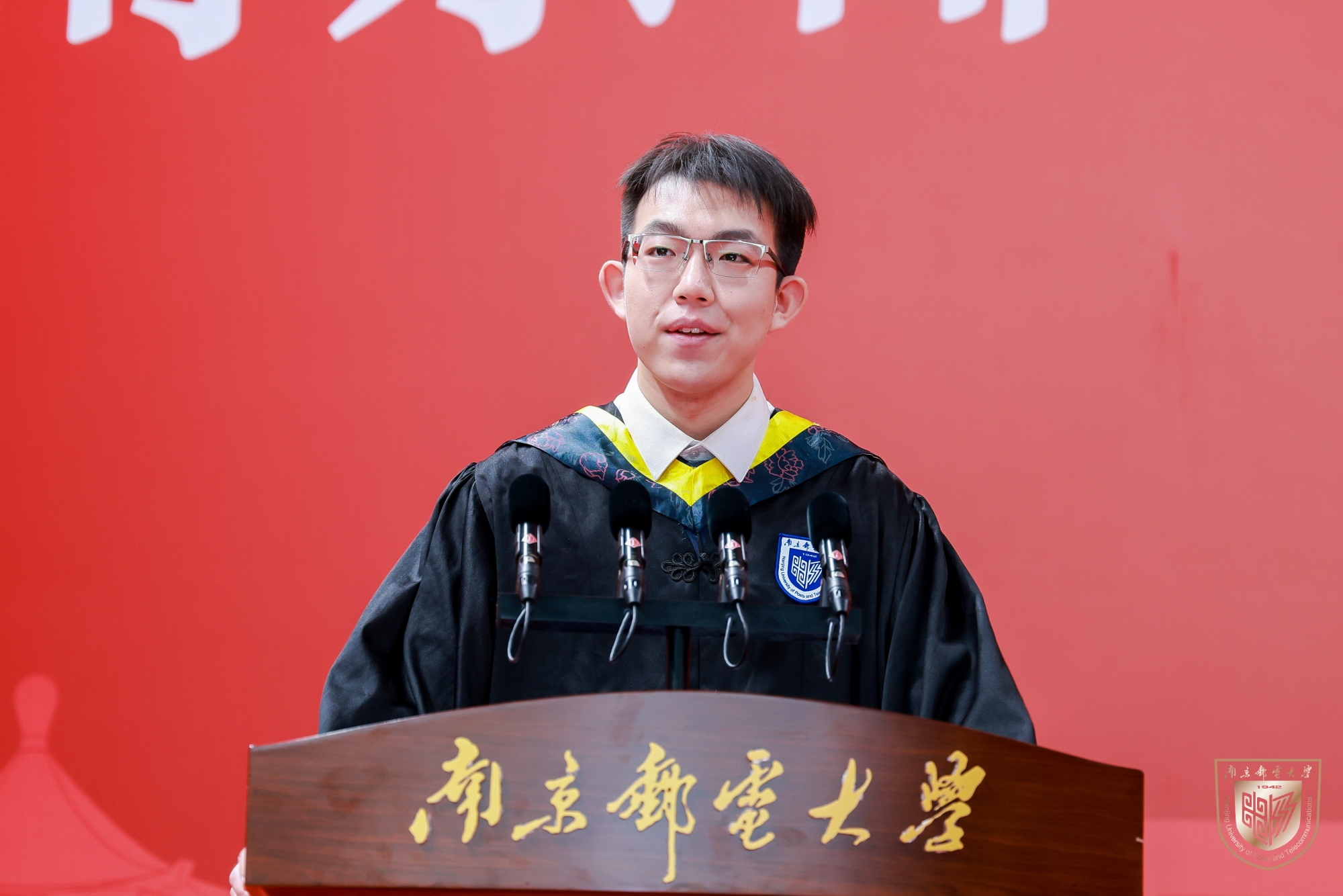 涓涓滴水成甘澧,满园桃李竞芬芳。教师代表,本硕博均在南邮学习成长的国家级青年人才、材料科学与工程学院博士生导师凌海峰发言。他回顾了在南邮的求学时光,细述求学旅途中的成长与蜕变,并向毕业生们提出了三点期望:一是做信息报国的传承者,将个人发展与国家发展紧密结合,为建设信息强国贡献力量;二是做正直守信的践行者,在复杂社会中坚守信仰和道德底线,勇于承担责任;三是做感恩情怀的弘扬者,珍惜并感激生活中的一切。“今天你是南邮人,明天毕业了你还是南邮人,永远都是南邮人!”