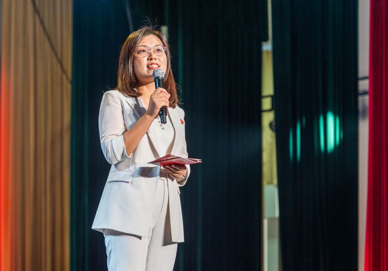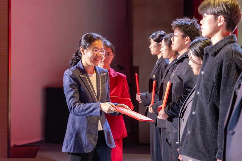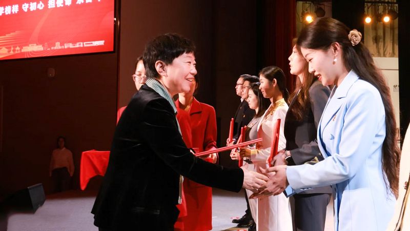 在“光荣的使命”篇章中,叶美兰校长为在学生教育培养工作中涌现出的先进集体和个人代表颁奖。外国语学院辅导员高艳丽作为代表发言。她分享了自己十年辅导员工作的心路历程,作为辅导员,应注重学生的理想信念教育,当好学生们的筑梦人。她勉励各位辅导员再接再厉,汲取榜样的力量,从“培训赋能”“管理促强”“考核提效”“评先创优”四个方面不断提升自己的综合素质,在各自的岗位上绽放光彩,为学生的成长撑起一片天空,共同担当起培养时代新人的光荣使命。